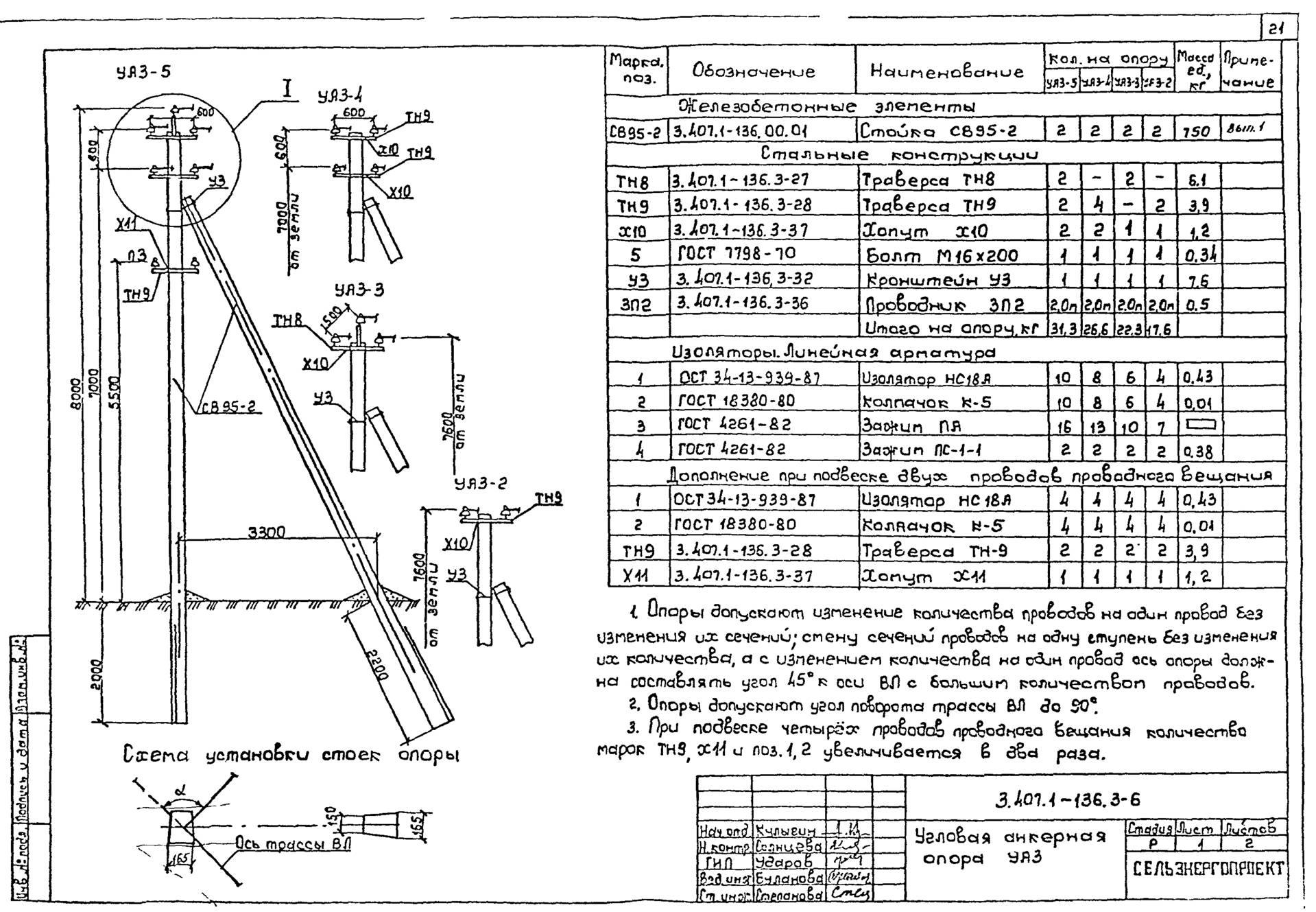 Установка изделий угловые анкерные опоры УА3 для ВЛ 0,38кВ начинается с выкладки деталей опоры вдоль трассы, для ее дальнейшей сборки. Собранную на земле, конструкцию опоры ЛЭП с помощью крана поднимают в проектное положение и устанавливают в цилиндрический котлован с заполнением пустот песчано-гравийной смесью. В грунтах с малой несущей способностью прочность крепления достигается путем фиксирования стоек опор ригелями и установкой их на специальные опорные плиты. Для крепления в земле оттяжек на проектном расстоянии от опоры устанавливаются анкерные плиты, или другие фундаментные конструкции в соответствии с проектом.