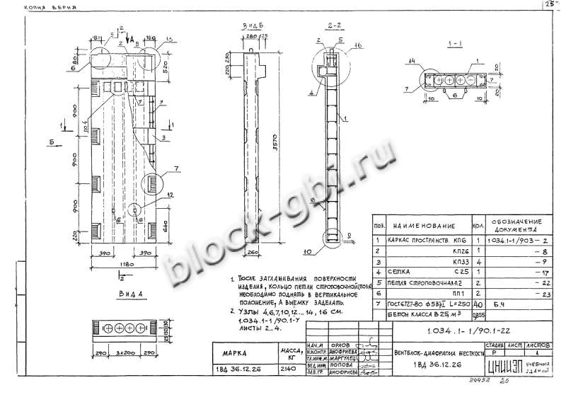 Вентиляционный блок 1ВД 36.12.26 с консолью для опирания плит перекрытия изготавливается из тяжелого и легкого бетона марки М-200, класс бетона по прочности на сжатие – не менее В15, морозостойкость и водостойкость – F75 и W4 соответственно. Для армирования блоков используют стержневую арматурную сталь классов Ат-III, Ат-IIIС, Ат-IV и Ат-IVС по ГОСТ 10884 и класса А-III по ГОСТ 5781, а также арматурную проволоку повышенной прочности класса Врп-1 по ТУ 14-4-1322 и класса Вр-1 по ГОСТ 6727.